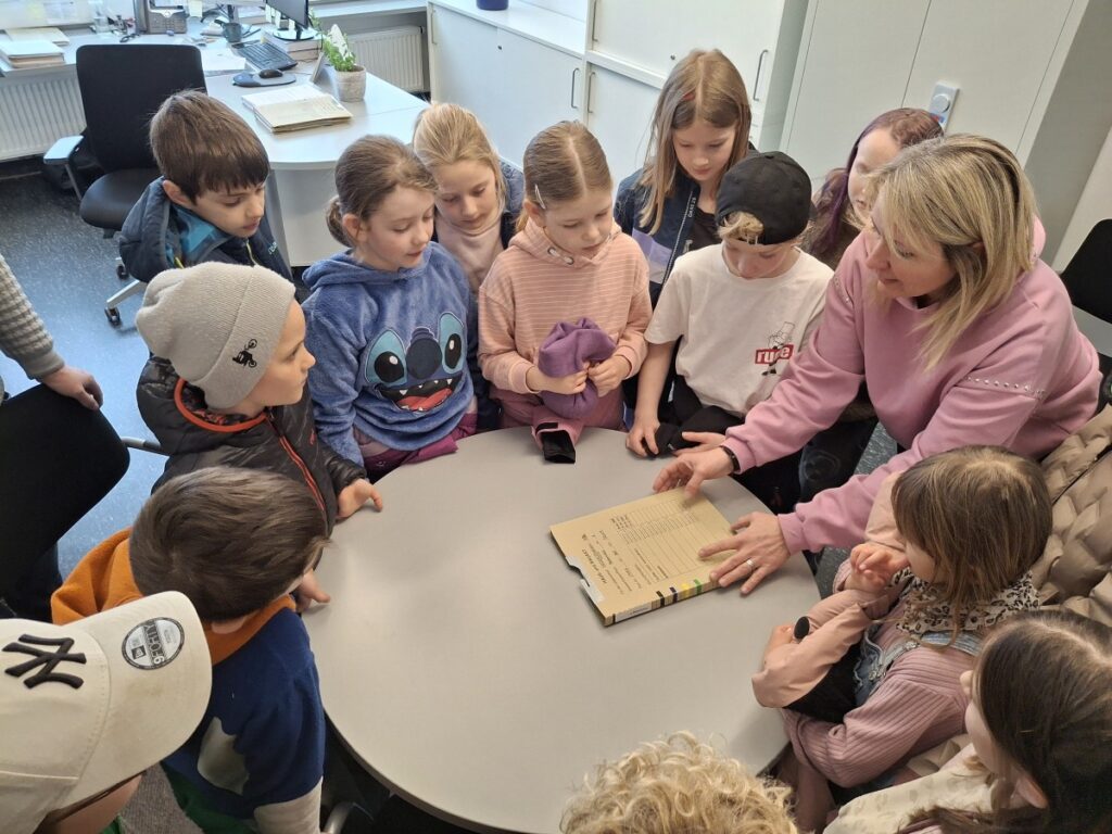 Dort angekommen, wurden die Kinder herzlich empfangen und durften gleich einen Blick hinter die Kulissen werfen. Besonders interessant war der Besuch im Archiv, wo viele alte und wichtige Dokumente aufbewahrt werden. Die Schülerinnen und Schüler staunten, wie sorgfältig hier alles gesammelt und geordnet wird.